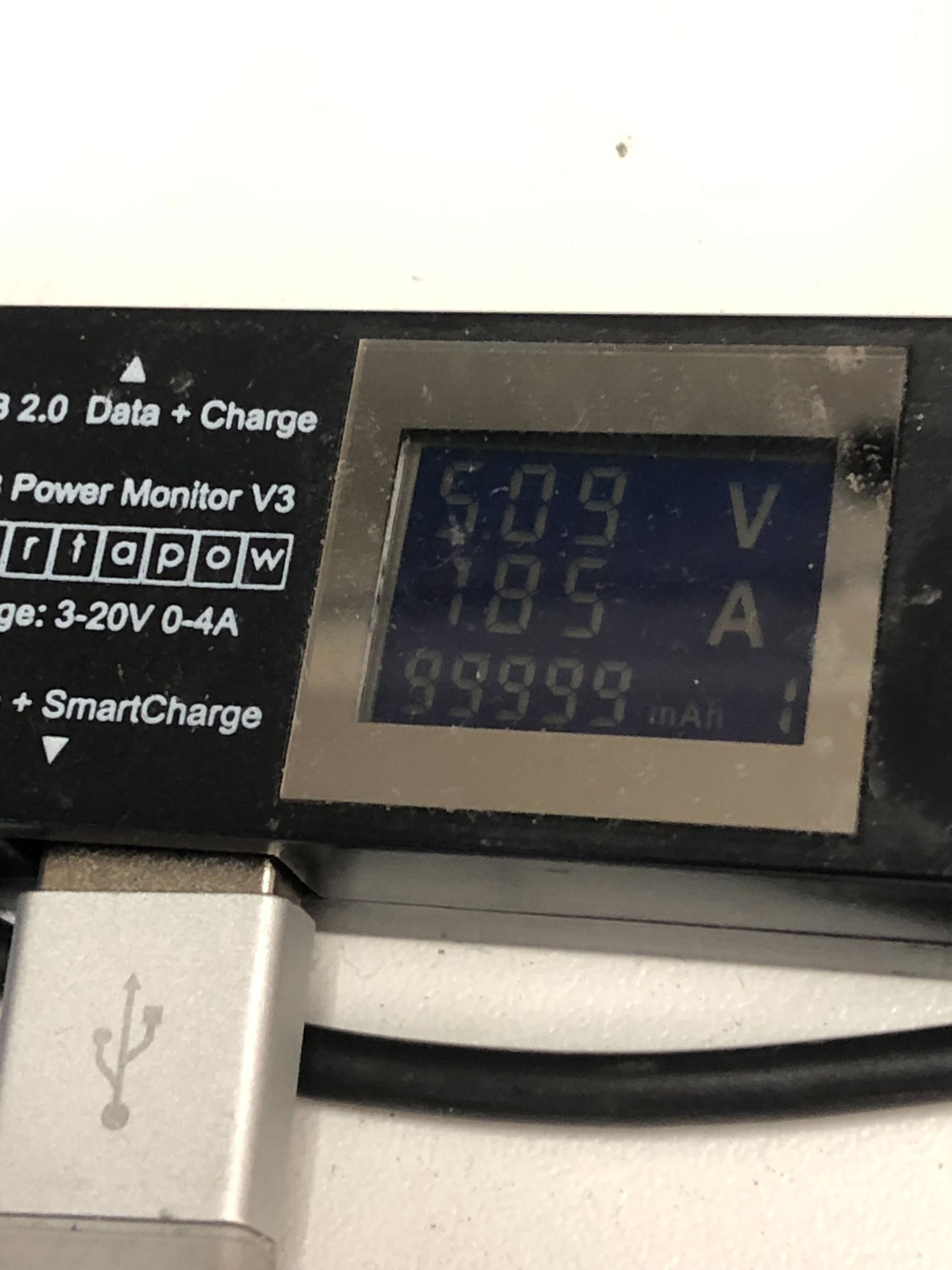 Once the repair is done and the iPad 7 has a new tristar, we test it out and make sure that it will charge. We like to use a USB ammeter so we can see the voltage and how many amps the iPad is pulling. When it's not charging it will draw 0 amps(A), in this photo you can see it's pulling 1.85 amps so it's charging properly and has been fixed.
